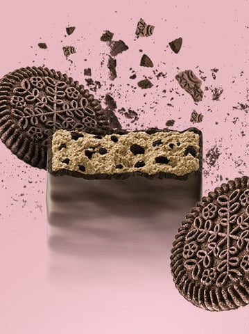 Umettenti (maltitoli, glicerina), copertura al cacao [umettenti (maltitoli), grassi vegetali completamente idrogenati (cocco,colza), cacao magro in polvere, emulsionante (lecitine)] 15%, pezzetti di biscotti [farina di riso, zucchero, amido di mais, olio di cocco raffinato, cacao magro in polvere, sciroppo di glucosio, sale, addensante (gomma di guar), agente di carica (bicarbonato di ammonio, bicarbonato di sodio), aroma] 10%, concentrato di proteine del siero di latte, concentrato di proteine del latte, frutto-oligosaccaridi, collagene idrolizzato, olio di cocco completamente raffinato, isolato di proteine del siero di latte {isolato di proteine del siero di latte, emulsionante [lecitine (soia)]}, acqua, farina di mandorle, emulsionante [lecitine (soia)], aromi, gelificante (carragenina), conservante (sorbato di potassio), stabilizzatore (cloruro di potassio), antiossidanti (alfa-tocoferolo), edulcoranti (sucralosio). Prodotto in uno stabilimento che lavora anche uova, arachidi, frutta a guscio, sedano, pesce, crostacei e anidride solforosa.