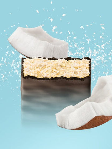 Umettenti (maltitoli, glicerina), copertura al cacao [edulcorante (maltitoli), grassi vegetali completamente idrogenati (cocco, colza), cacao magro in polvere, emulsionante (lecitine)] 15%, granelli di cocco 15%, concentrato di proteine del siero di latte, frutto-oligosaccaridi, concentrato di proteine di latte, collagene idrolizzato, olio di cocco completamente raffinato, isolato di proteine del siero di latte istantaneo {isolato di proteine del siero di latte, emulsionante [lecitine (soia)]}, acqua, farina di mandorle, emulsionante [lecitine (soia)], gelificante (carragenina), aromi, conservante (sorbato di potassio), stabilizzatore (cloruro di potassio), antiossidanti (alfa-tocoferolo), edulcorante (sucralosio).
